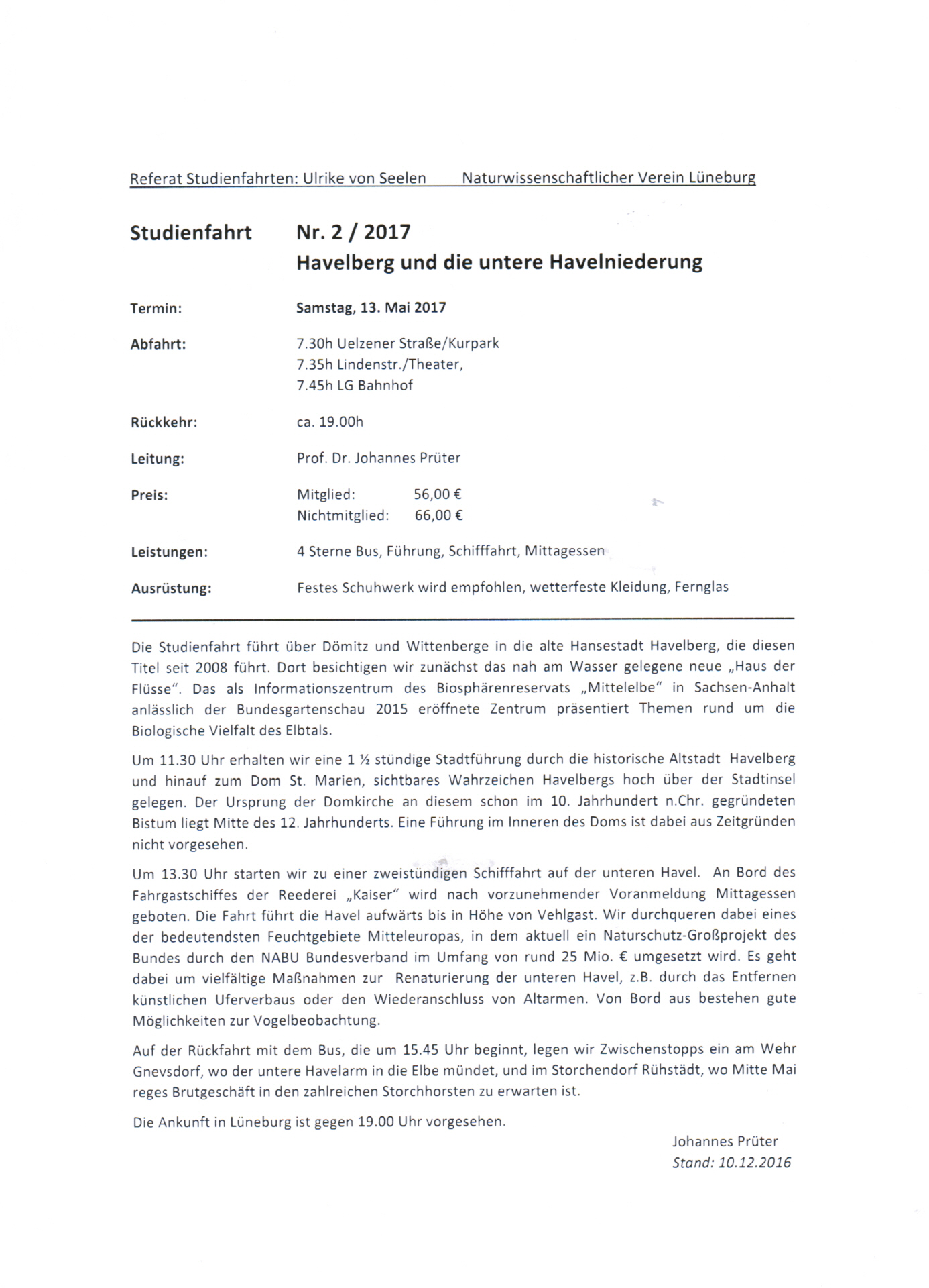 Die Studienfahrt führt über Dömitz und Wittenberge in die alte Hansestadt Havelberg. Dort besichtigen wir zunächst das neue „Haus der Flüsse“ / Informationszentrum des Biosphärenreservats „Mittelelbe“ in Sachsen-Anhalt. Es folgt eine Stadtführung durch die historische Altstadt Havelbergs. Um 13.30 Uhr starten wir zu einer zweistündigen Schifffahrt auf der unteren Havel mit Informationen zum Havelprojekt, einem der größten aktuell laufenden Renaturierungsvorhaben an Fließgewässern in Deutschland. Die Rückfahrt erfolgt mit Zwischenstopp im Storchendorf Rühstädt.